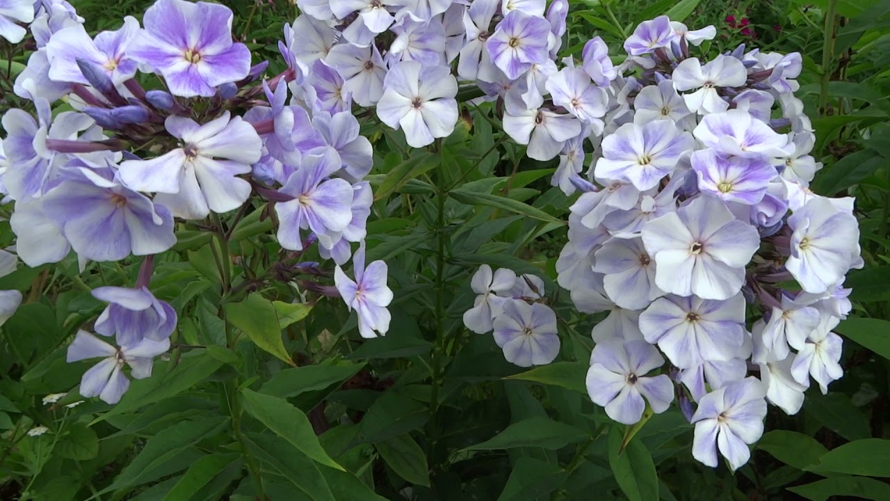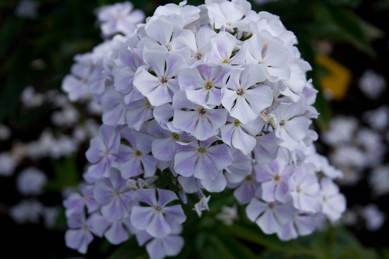 Флокс Голубой Карлик. Большая часть цветков перламутрово-белая, но на лепестки некоторых из них словно попали капли светло фиолетовой краски. Изумительное сочетание, кажущееся необыкновенно нежным. Цветки выглядят миниатюрными, их диаметр — 3,5 см, а кончики лепестков чуть приподняты кверху и слегка закручены. Соцветия пышные, изящной шаровидной формы. Нераспустившиеся бутоны приобретают нежный васильковый оттенок.