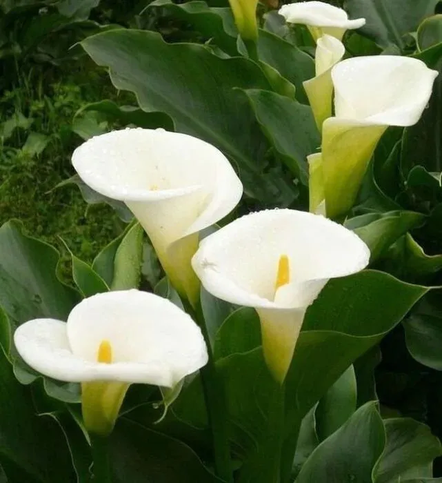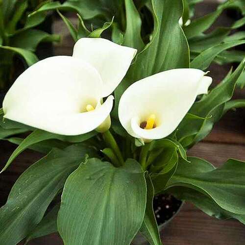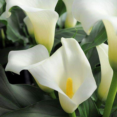 Калла (зантедеския) «Элеганца Сван» — эталонный сорт белых калл, выведенный для ценителей классической красоты. Его крупное покрывало (прицветник) отличается безупречно белой, фарфорово-кристальной окраской без малейших посторонних оттенков. Форма цветка — совершенная, с тщательно выверенными пропорциями: удлинённая, элегантно изогнутая воронка с острым, плавно отогнутым кончиком, напоминающим крыло лебедя. Поверхность покрывала имеет лёгкий сатиновый блеск, который усиливает ощущение чистоты. В центре цветка гармонично возвышается солнечно-жёлтый, плотный и прямой початок, добавляющий тёплый, живой акцент. Растение формирует крепкие, прямые цветоносы высотой 60–80 см, которые несут по одному величественному цветку. Листья крупные, стреловидные, насыщенного тёмно-зелёного цвета с ярко выраженным глянцевым блеском и изящным серебристым крапом, создающим эффект морозного узора. Декоративная листва сохраняет привлекательность весь сезон.