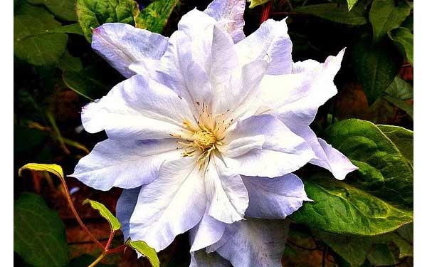 Клематис Халцедония отличается утонченной цветовой гаммой, напоминающей переливы полудрагоценного камня. Основной тон лепестков — нежно-белый с голубым и сиреневым подтоном, создающий эффект мерцания. По всей поверхности лепестков проходят тонкие фиолетово-голубые прожилки, добавляющие цветку глубину и объем. Широкие лепестки с волнистыми краями образуют изящную чашу, в центре которой контрастно выделяются кремово-желтые тычинки. Сорт выглядит свежо и элегантно, особенно в утренние и вечерние часы.