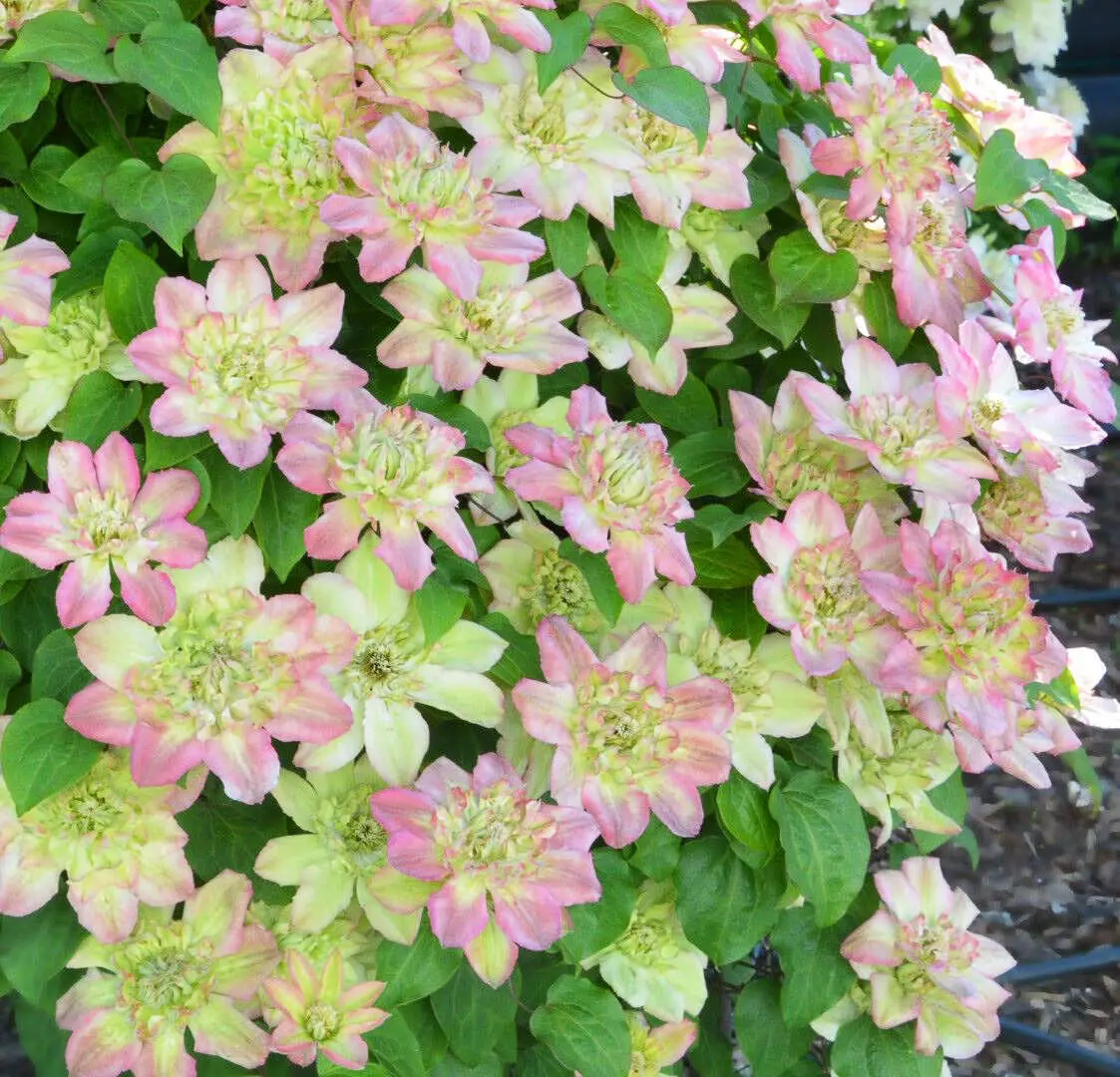 Краткий обзор: Экзотический сорт с уникальными зелено-бело-розовыми цветами, напоминающими нежный десерт. Компактный и обильноцветущий клематис для создания необычных акцентов в саду.