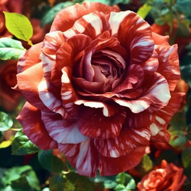 Это плетистая роза оригинальной расцветки. В первые дни цветения показывает оттенки шоколада и кофе. Листва плотная, тёмно зелёная, густая. Цветок 9-10см. 37 лепестков