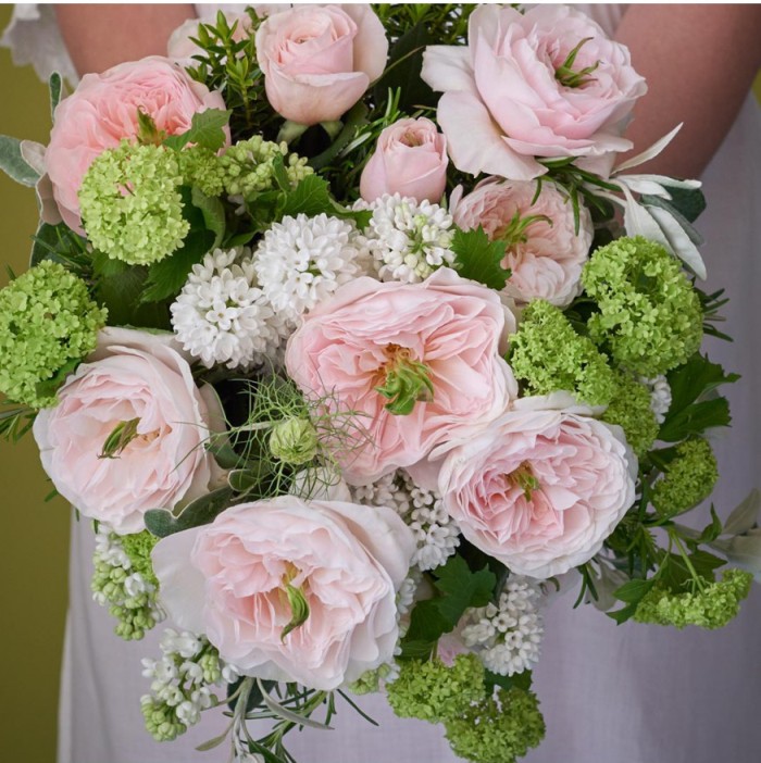 Срезочный сорт. Уникальная «свадебная» роза в коллекции Дэвида Остина. Цветы стоят в вазе 5-7 дней. Бутоны округлые. Цветки крупные, диаметром 11 см, густомахровые (до 150 лепестков), розетковидные, в основном одиночные. Внешние лепестки почти белые, окружают массу мелких светло-персиково-розовых внутренних лепестков. Тычинки зелёные, заметные. Аромат мирры, насыщенный. Цветение почти непрерывное в течение сезона. Листва кожистая, устойчивая к заболеваниям. Шипов мало. Куст прямостоячий, высотой 100-110 см и шириной до 90 см. Зона 6 (до -18ºС).