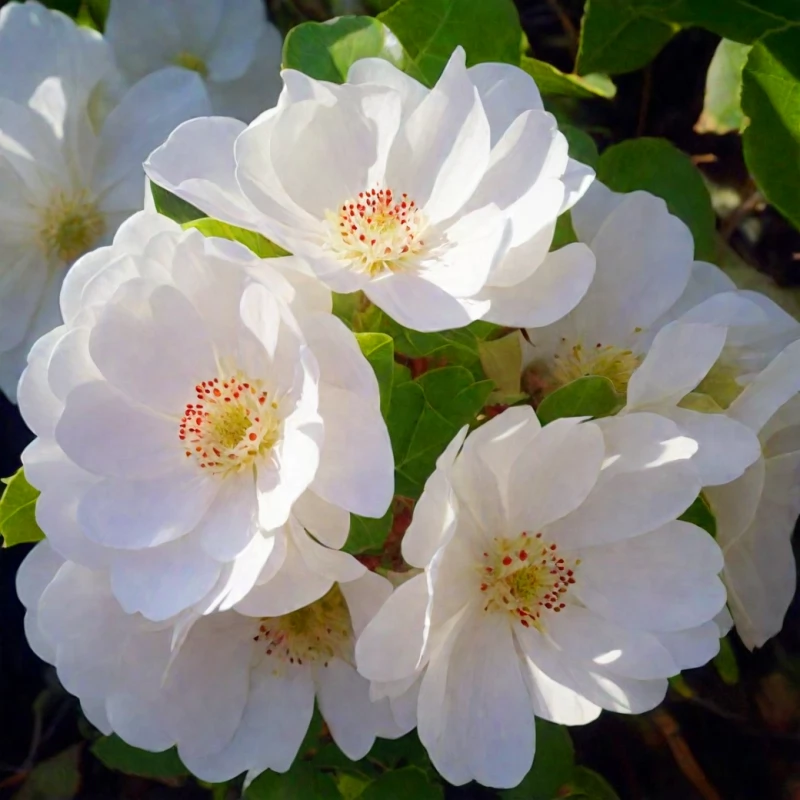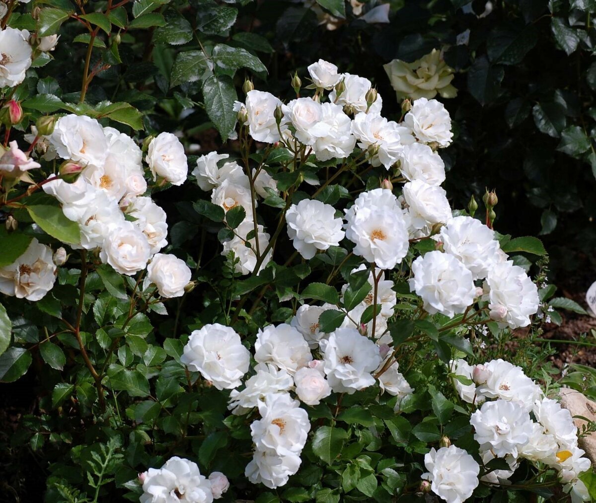 Белые полумахровые цветки распускаются и открывают букет ярко окрашенных тычинок. Аромат цветов и фруктов. Куст энергично растущий, высотой 60-80 см, очень крепкий и крайне устойчивый к болезням. Для массивов и бордюров. Цветение повторное, до заморозков. Сорт имеет 3 медали.