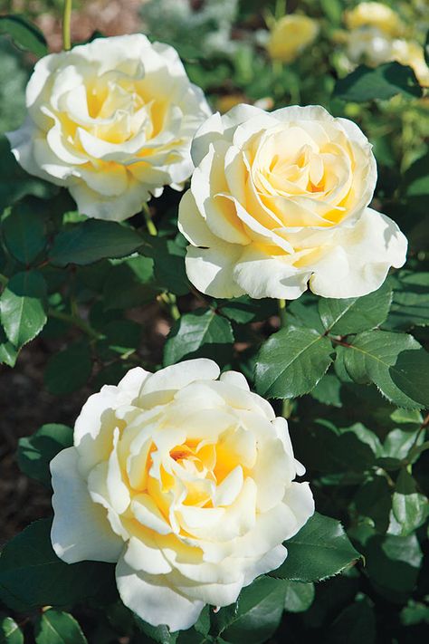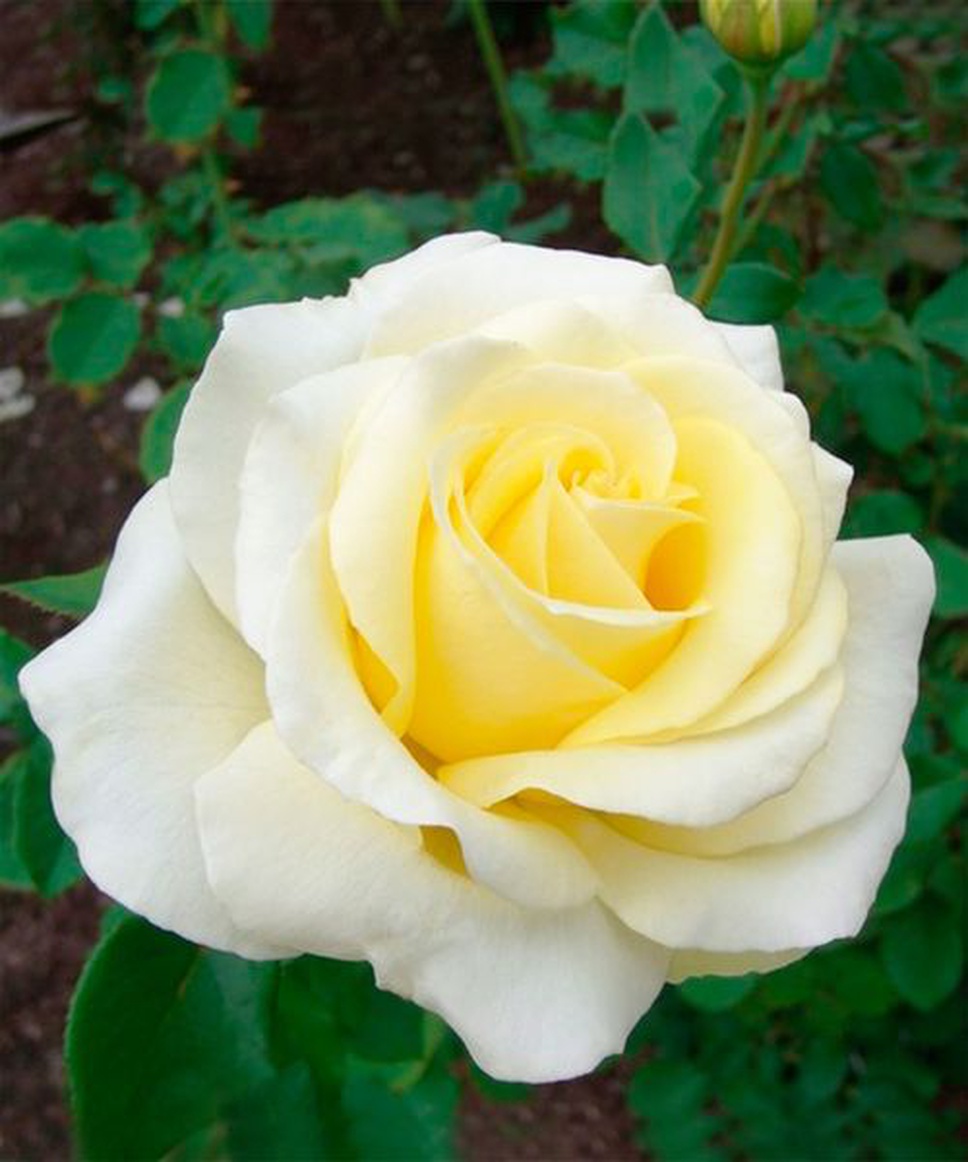 При распускании классических заостренных бутонов появляются круглые роскошные цветки – часто диаметр цветка из 45 лепестков превышает 13 см. Цветки остаются чистыми и свежими и в жару, и в холод, и при повышенной влажности. Листва крупная, темная, блестящая, сорт очень устойчив к болезням. Куст сильнорослый, высота 90 см, ширина 60 см. Для смешанных и одиночных посадок. Хорошо смотрится в штамбовой форме.