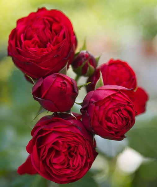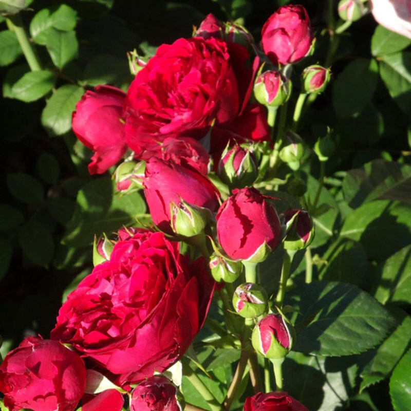 Роза группы спрей. Куст высотой до 80 см, шириной до 50-60 см. Цветки малиновые до 8 см в диаметре, махровые (более 40 лепестков). Зацветают кистями по 3-5 штук. Цветение продолжительное и обильное. Аромата практически нет. Сорт подходит для срезки, так как в вазе стоит более 10 дней. Устойчивость к болезням и дождю высокая. Зона 5-6 (до -18…-23ºС).