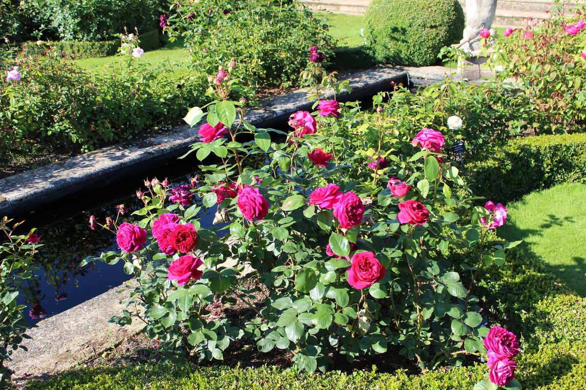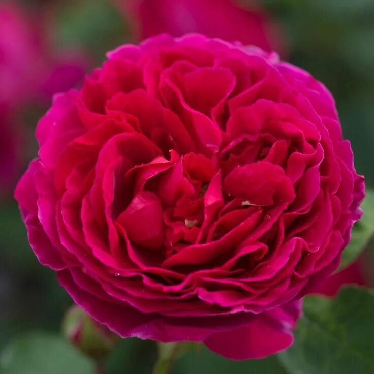 Роза Хитклифф — Сорт отличают большие махровые цветы в форме глубокой розетки. Цвет темно-красный, несколько теплого оттенка, который напоминает цвет некоторых старинных Галльских роз красного цвета. Куст скорее вертикальный, листва темно-зеленая, блестящая, устойчивая к болезням. Запах и приятный, и необычный — смесь ароматов чайных роз со старинными и едва уловимыми нотами кедра.