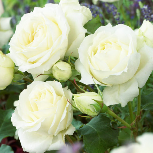 Роза из серии «Frayla». Красивая роза, ароматные цветки которой прекрасно контрастируют с листвой. Они также будут центральным элементом в любой вазе. Цветки диаметром 6-8 см, махровые, вначале кремово-жёлтые, затем снежно-белые, в соцветиях. Цветение повторное. Листва тёмно-зелёная, устойчивая к болезням. Куст сильный, высотой 60-70 см. Идеальная роза для заднего плана бордюра в сочетании с другими розами или многолетниками средней высоты.