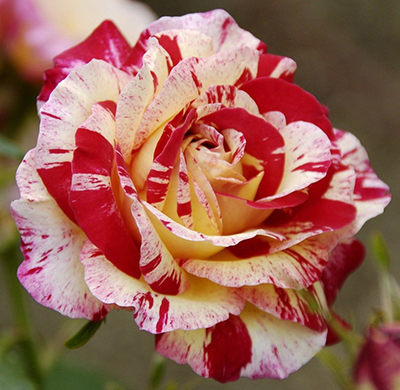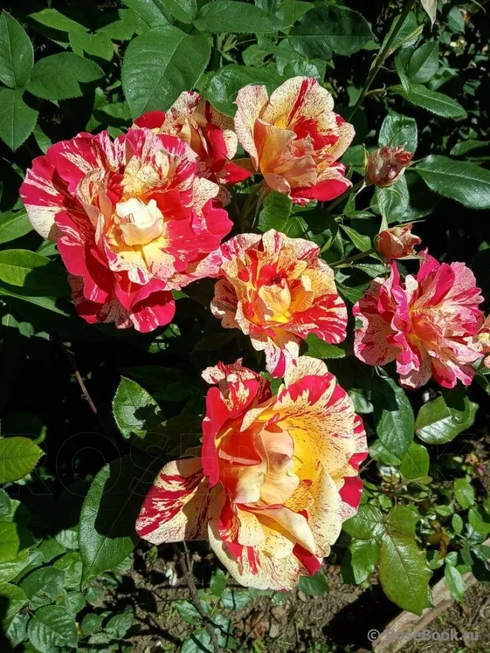 Жизнерадостная и солнечная, заметна даже издали. Цветки диаметром 6-8 см, махровые, полосатые, яркие, красно-жёлтые с центром из золотистых тычинок, собраны в пышные соцветия. Лепестки со слегка волнистыми краями. Цветение обильное, повторное. Листва устойчивая к заболеваниям. Куст высотой 60-70 см. Подходит для маленьких садов и выращивания в больших горшках. Любит компаньонов из садовых растений кремовых оттенков. Идеальна для посадки в центре клумбы.