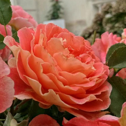 Цветки махровые, старинной формы, оранжевые с контрастными бледно-розовыми кончиками. Аромат лёгкий. Цветение раннее, повторное цветение очень хорошее. Листва тёмно-зелёная. Молодые побеги красные. Куст высотой 100-120 см.