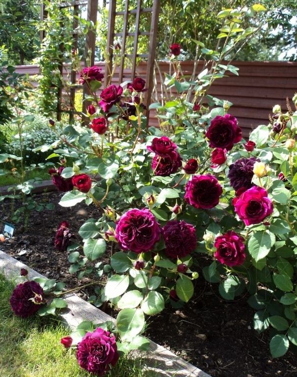 Одна из самых эффектных роз с изящными дугообразными побегами. Цветки диаметром 6-7 см, в соцветиях по 5-10, густомахровые, розеточной формы, густо-малинового цвета, который «не сгорает» на ярком солнце и постепенно переходит в тёмно-пурпурный. Аромат старинных роз, сильный. Куст раскидистый. В тёплом климате растёт энергично и может использоваться как невысокая плетистая роза, в прохладном климате куст высотой 75 см, шириной 60 см. Цветёт всё лето и осень, повторное цветение хорошее. Нуждается в подкормках.