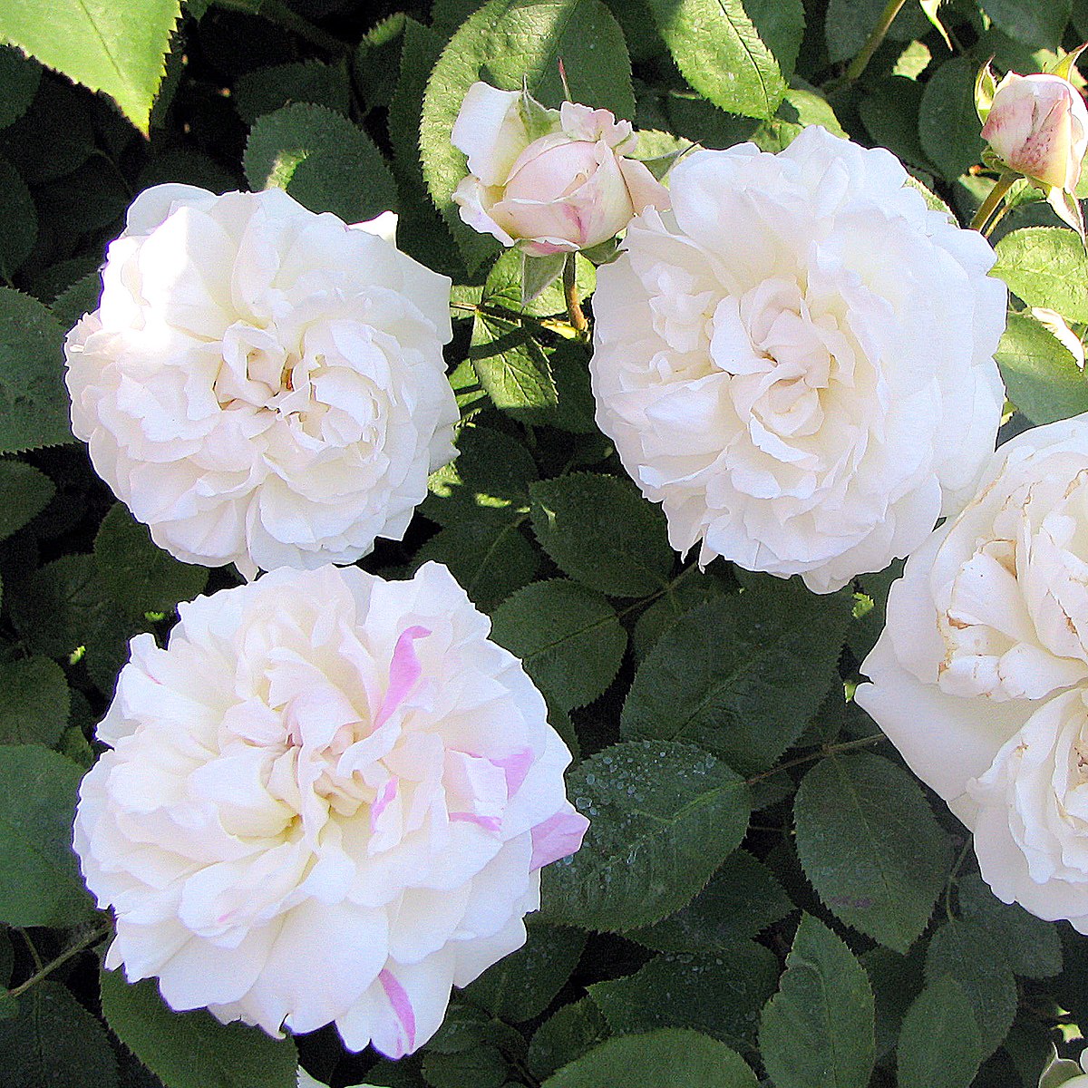 Общее впечатление от созерцания этой розы восхитительное! У неё очень красиво сформированный, хорошо разветвлённый куст высотой и диаметром 120 см, пышная листва и белые махровые цветки, в изобилии покрывающие весь куст и регулярно появляющиеся в течение всего лета. Аромат тонкий, как у старинных роз, с намёком на мёд и цветки миндаля. Хорошо цветёт повторно.